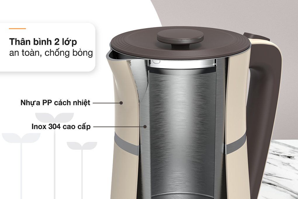 - Lớp vỏ bình bằng chất liệu nhựa PP cách nhiệt giúp tránh bỏng, tăng độ an toàn khi sử dụng. Không những thế, nhựa PP có đặc điểm không mùi, không vị, không độc, có độ bóng bề mặt cao và chịu nhiệt tốt nên được sử dụng rất phổ biến trong các thiết kế đồ gia dụng.