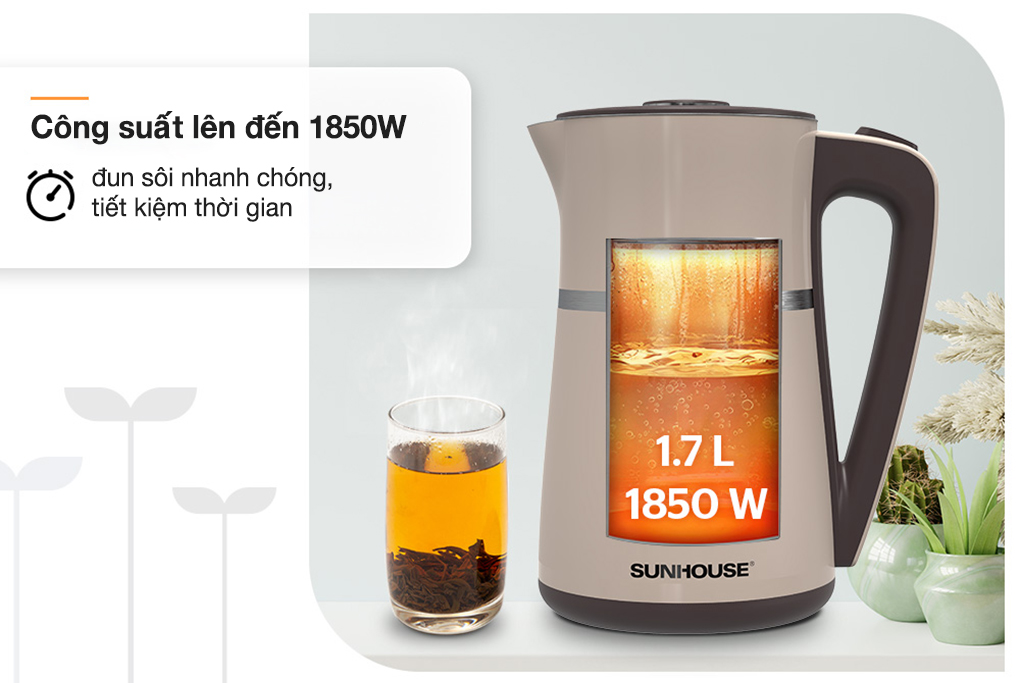 Ấm đun siêu tốc Sunhouse SHD1360 dung tích 1.7 lít, hoạt động với mức công suất lên đến 1850W đun sôi nước nhanh chóng, tiết kiệm thời gian, đáp ứng tốt nhu cầu sử dụng cho gia đình.