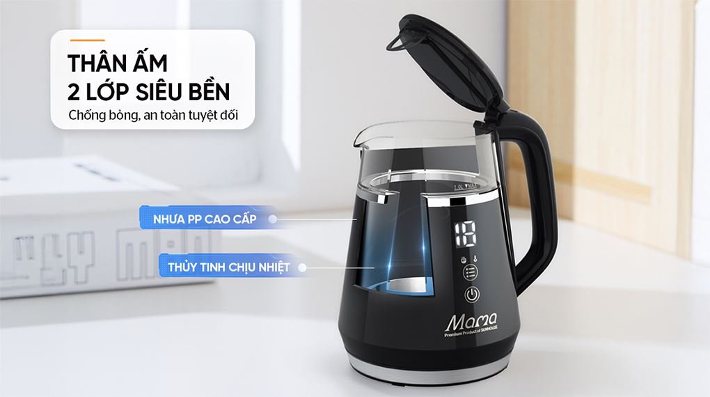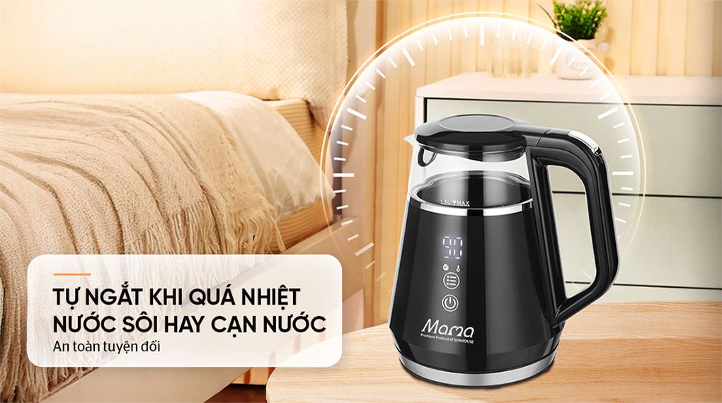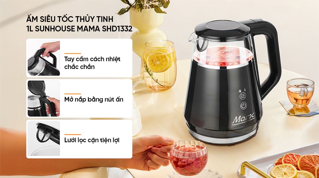 Bình đun siêu tốc Sunhouse Mama SHD1332 dung tích 1 lít có thiết kế nhỏ gọn, công suất 1000W giúp đun nước nhanh, đáp ứng nhu cầu pha trà, cà phê, pha sữa hay nấu mì tiện lợi. Sản phẩm còn được trang bị nhiều tiện ích như hiển thị nhiệt độ, lưới lọc cặn và các chế độ an toàn, mang lại trải nghiệm sử dụng thuận tiện trong gia đình.