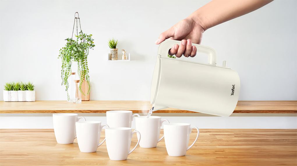 Vỏ ngoài bình đun siêu tốc Tefal bằng nhựa giúp hạn chế nóng khi chạm vào, đồng thời giữ trọng lượng bình nhẹ để dễ di chuyển