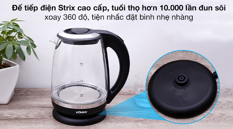 Thiết kế bình đun siêu tốc Hommy với đế xoay 360 độ trên đế tiếp tiện, thật nhẹ nhàng để nhấc và đặt bình lên xuống từ đế nấu.