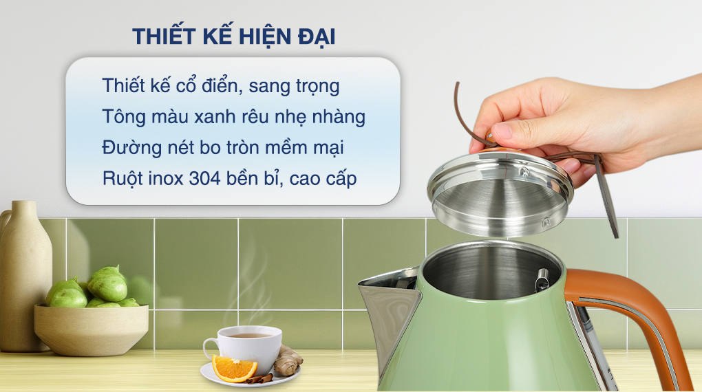 Bình đun siêu tốc mang phong cách hoài cổ kết hợp sắc xanh rêu tinh tế, tạo điểm nhấn nổi bật cho gian bếp hoặc phòng khách. Thân bình bằng kim loại chống gỉ có độ bóng đẹp, ruột inox 304 bền chắc và dễ vệ sinh.
