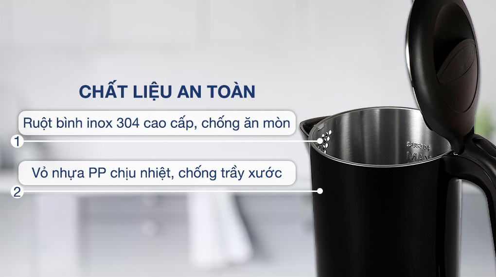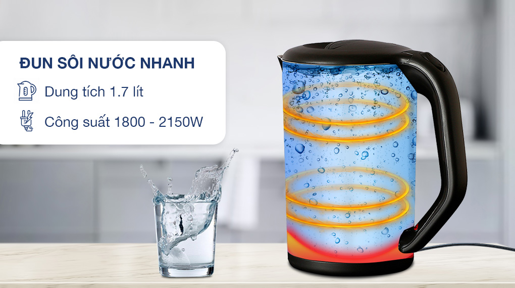 - Công suất mạnh mẽ 1800 - 2150W, cho thời gian đun sôi nước nhanh chóng, giúp tiết kiệm điện năng tối đa.