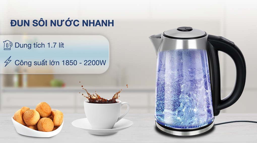 - Công suất lớn 1850 - 2200W, cho thời gian đun sôi nước nhanh chóng, giúp tiết kiệm điện năng tối đa.