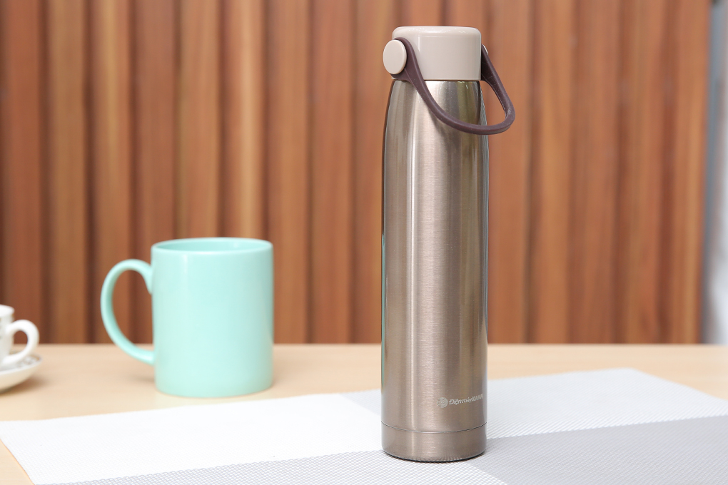 - Bình giữ nhiệt với nắp đậy thiết kế vặn kín, vừa với thân bình, có quai xách dễ di chuyển.