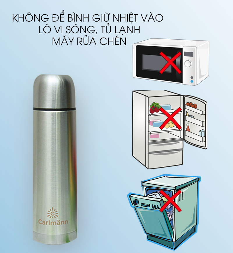 - Chất liệu bình bằng kim loại nên không dùng cho lò vi sóng và cũng không dùng cho máy rửa chén hay tủ lạnh.