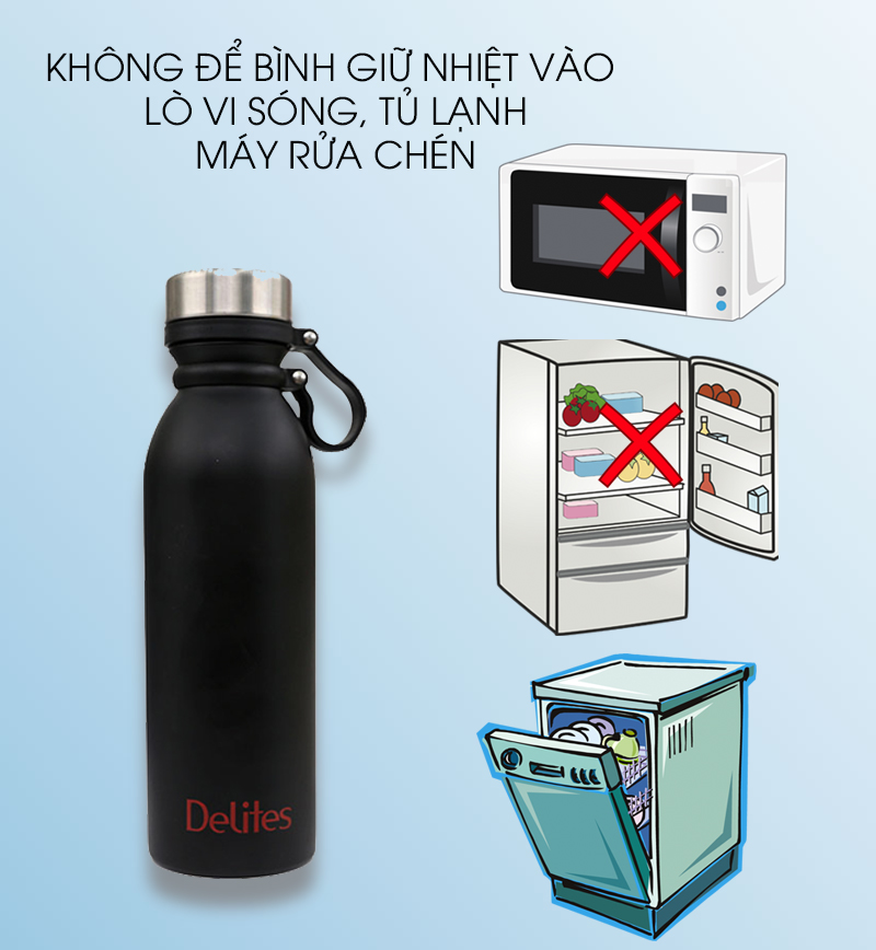 - Chất liệu bình bằng kim loại nên không dùng cho lò vi sóng và cũng không dùng cho máy rửa chén hay tủ lạnh.