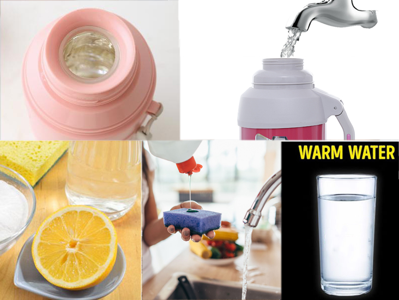 Cách 2: Pha loãng nước ấm với nước rửa chén rồi đổ vào bình, đậy kín nắp để qua đêm. Sáng hôm sau bạn rửa lại bằng nước sạch hoặc nước ấm 3-5 lần.