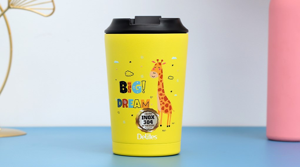 - Ly giữ nhiệt Delites có kiểu dáng đơn giản, sắc vàng nổi bật cùng hoạ tiết hoạt hình sinh động.