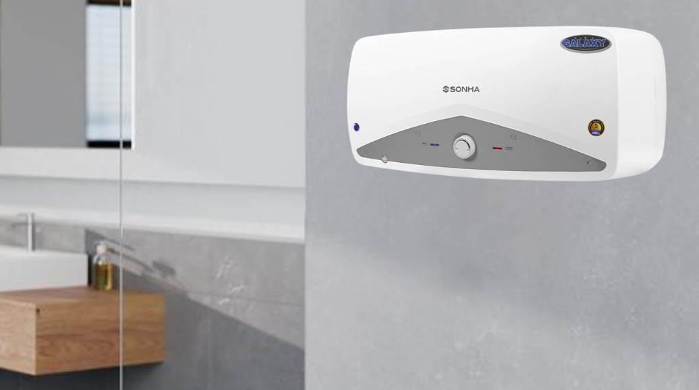 - Bình nóng lạnh Sơn Hà có thiết kế hình chữ nhật ngang cùng màu trắng chủ đạo, phù hợp lắp đặt cho mọi không gian bên trong khu vực nhà tắm.