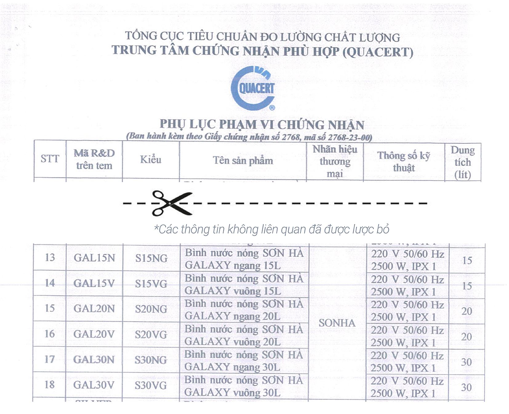 Giấy chứng nhận sản phẩm bình nóng lạnh Sơn Hà có sự khác nhau về mã R&D trên tem và mã trên tên sản phẩm