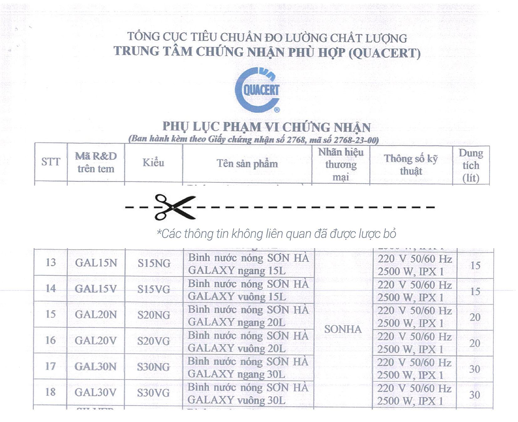 Giấy chứng nhận sản phẩm bình nóng lạnh Sơn Hà có sự khác nhau về mã R&D trên tem và mã trên tên sản phẩm.