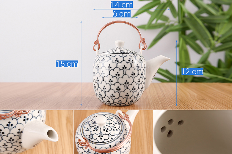 Tổng chiều cao ấm 15 cm, chiều ngang 14 cm để gọn vào khay gỗ.