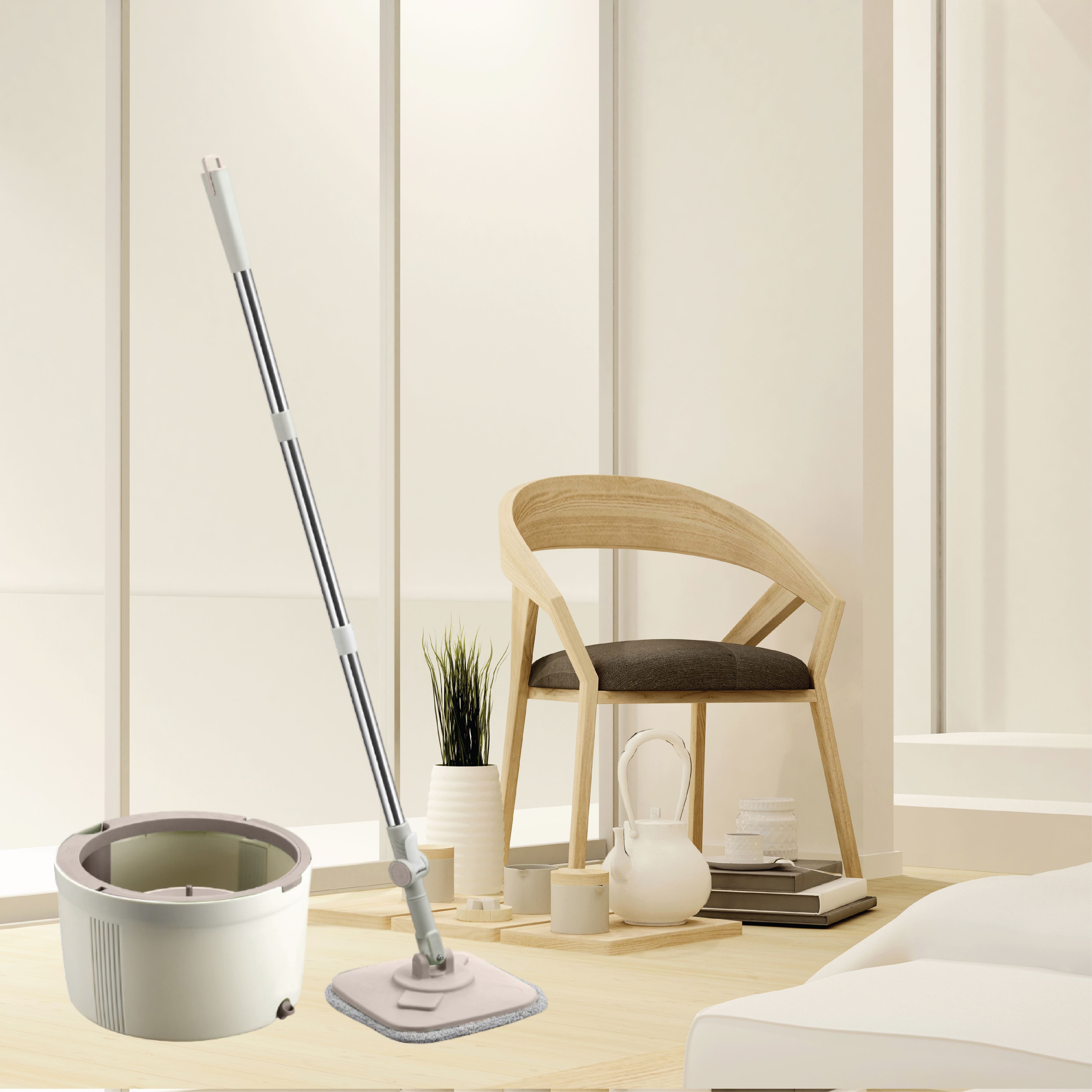 Bộ lau nhà có tông màu be nhẹ nhàng, phù hợp với nhiều không gian nội thất. Với cấu tạo gồm thùng lau, cây lau nhà, đĩa lau và hai bông lau thay thế, bộ sản phẩm đáp ứng nhu cầu lau dọn cơ bản trong gia đình. Thiết kế thùng lau kích thước 32 x 32 x 19.5 cm, đi cùng tay cầm dài đến 129 cm, giúp người dùng dễ thao tác mà không cần cúi người nhiều. Bộ lau có khối lượng khoảng 1.7 kg, khá nhẹ để di chuyển và cất gọn. Đầu lau dạng vuông cho khả năng tiếp cận góc tường và mép chân bàn hiệu quả hơn so với các đầu lau tròn truyền thống.