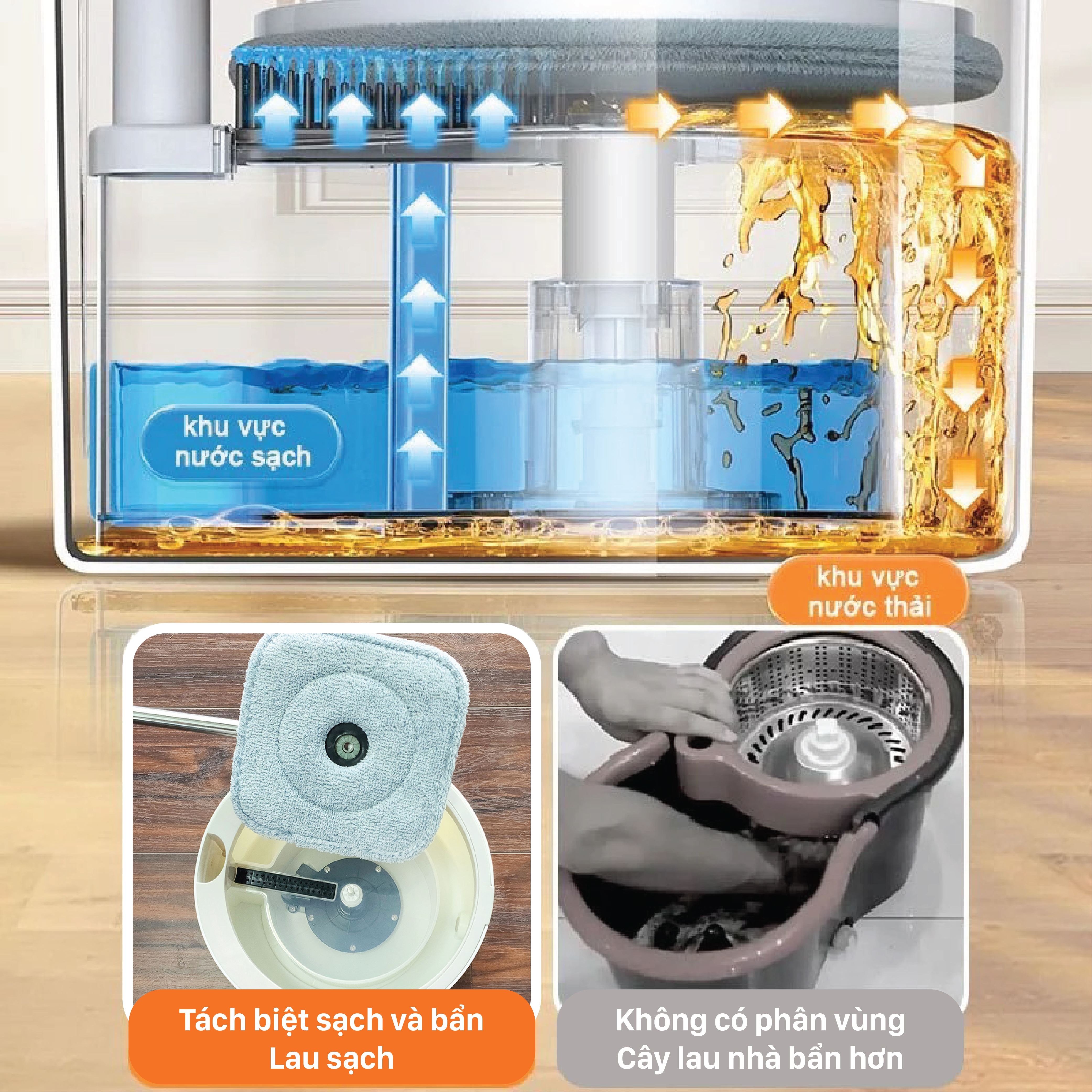 Một điểm đáng chú ý ở bộ lau nhà Tanaka là cơ chế tách biệt nước sạch và nước dơ trong thùng. Điều này giúp hạn chế tình trạng lau nhà bằng nước đã bẩn, đồng thời giảm thiểu nguy cơ tái bẩn trong quá trình sử dụng. Hệ thống vắt nước hoạt động bằng cách nhấn tay cầm, không cần tiếp xúc trực tiếp với bông lau, hỗ trợ làm khô nhanh chỉ trong khoảng 5 giây, rút ngắn thời gian chờ đợi giữa các lần vắt.