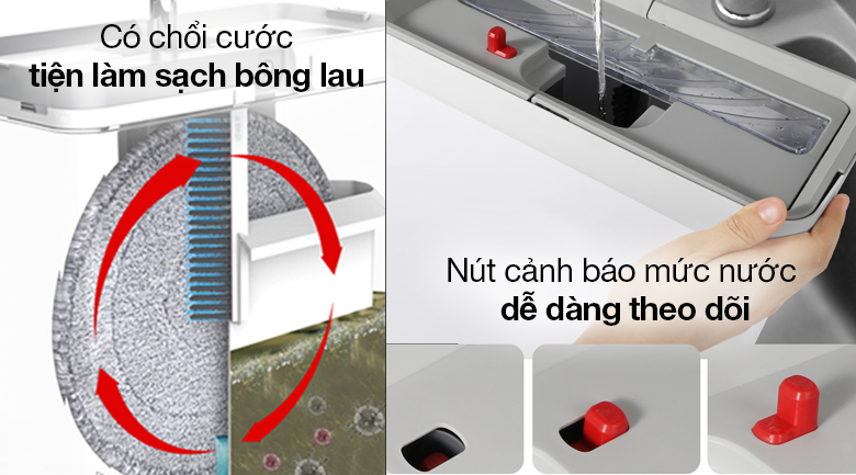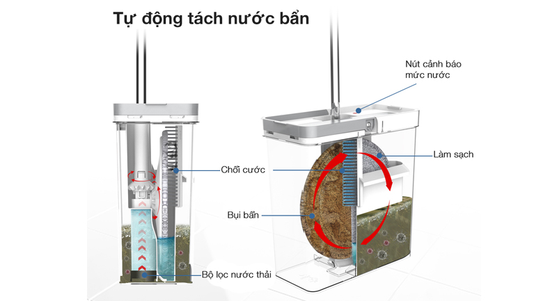 Sau khi ấn chổi xuống, khớp xoay sẽ phun lên 1 ít nước sạch vào bông lau. Đồng thời, phần chổi cước sẽ cọ vào bông lau để lấy đi bụi bẩn và nước bẩn sẽ chảy xuống hộc đựng nước bẩn đã được tách biệt với hộc nước sạch. Phần nước sạch vẫn sẽ nằm riêng biệt ở hộc khác mà không bị ảnh hưởng, đảm bảo mỗi lần bạn lau đều chỉ dùng nước sạch, không bị lẫn lộn với nước bẩn như các bộ chổi lau thông thường.