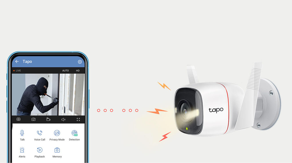 Để tăng cường bảo vệ, camera TP-Link còn hỗ trợ hệ thống cảnh báo bằng đèn LED và âm thanh. Khi có kẻ lạ tiếp cận, thiết bị sẽ kích hoạt ánh sáng nhấp nháy và phát ra âm thanh để cảnh báo. Ví dụ, nếu ai đó hành động khả nghi trước cửa nhà vào ban đêm, camera sẽ tự động phát cảnh báo, hạn chế nguy cơ xâm nhập trái phép.