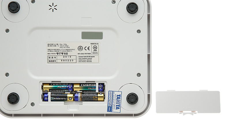 - Lắp đặt 4 viên pin AA vào hộp pin ở mặt sau của cân. Lưu ý lắp đúng cực pin.