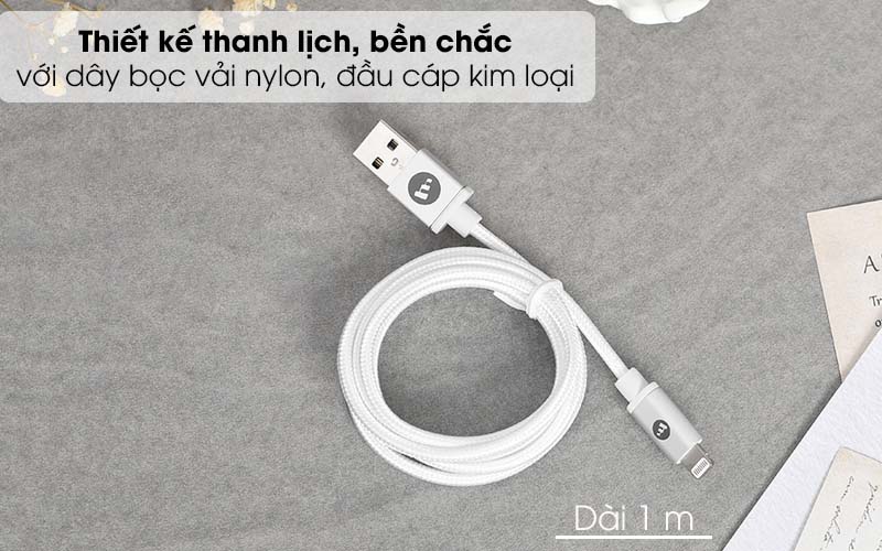 Cáp Lightning MFI 1m Mophie có dây dài 1 m, thân dây bọc vải nylon sạch đẹp, đầu cáp thiết kế bằng kim loại bóng sáng, tăng tính thẩm mỹ và độ bền cho bạn sử dụng dài lâu hơn.