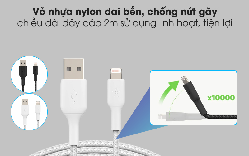 Lớp bảo vệ với khả năng chống nứt gãy đến 10.000 lần uốn cong cho bạn thoải mái quấn gọn cáp sạc và mang theo trong balo, giỏ xách, túi quần của mình.