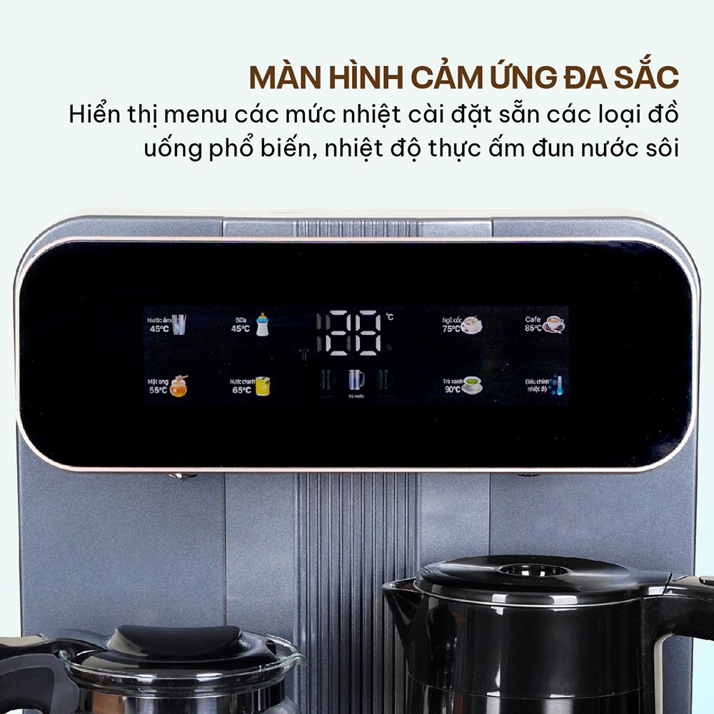 FUJIHOME TB243A mang sắc xám đen vân nổi cao cấp, lịch lãm, dễ dàng hòa hợp với mọi phong cách nội thất. Với kích thước nhỏ gọn và kiểu lắp bình nước âm trong tủ, sản phẩm này giúp không gian sống thêm phần tinh tế và ngăn nắp. Đặc biệt, bên trái của cây nước còn có một bình giữ nhiệt làm từ thủy tinh chất lượng, lý tưởng để bạn ủ trà, giữ ấm cà phê hoặc các loại thức uống khác, có thể tùy chỉnh thời gian và nhiệt độ theo ý muốn, giúp tiết kiệm điện năng khi không dùng liên tục.