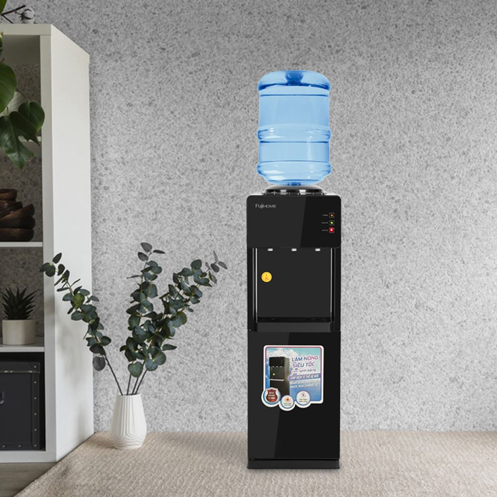 Cây nước nóng lạnh FUJIHOME thu hút mọi ánh nhìn với tông màu đen hiện đại, kích thước gọn gàng và kiểu dáng úp bình tiện lợi. Thiết kế này không chỉ giúp tiết kiệm diện tích mà còn dễ dàng hòa hợp với nhiều không gian nội thất khác nhau.