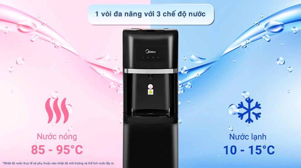 Cây nước nóng lạnh Midea được trang bị 3 chế độ nước: nóng, lạnh và nguội, mang lại sự tiện lợi cho nhiều nhu cầu khác nhau. Nước nóng duy trì ở mức 85 - 95°C, thích hợp để pha trà, cà phê, pha sữa hay nấu mì nhanh chóng. Nước lạnh ở khoảng 10 - 15°C, mang lại cảm giác mát lạnh sảng khoái trong những ngày oi bức. Thêm vào đó, máy còn có nước nguội để uống trực tiếp hoặc sử dụng khi chế biến món ăn.