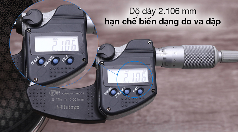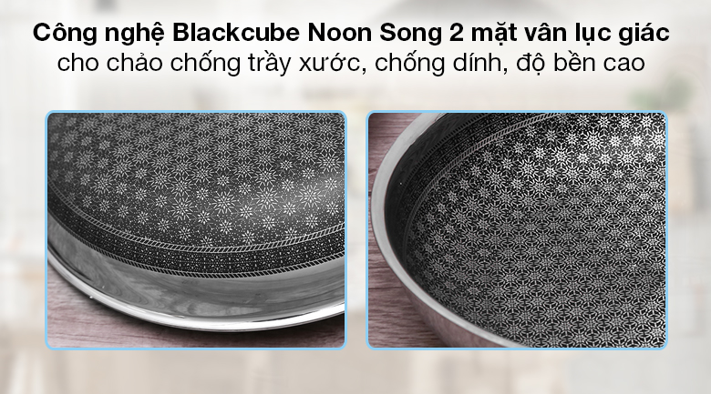 Ngoài ra, mặt đáy nồi khoan khắc hình bông tuyết, phần hoa văn nổi lên là inox, phần nền màu đen là lớp chống dính cho thiết kế độc lạ, hạn chế dầu mỡ bám vào, dễ dàng vệ sinh, không bị ố vàng.