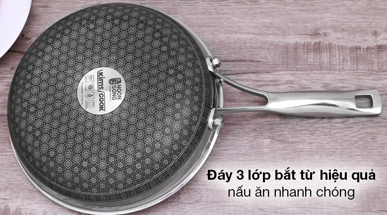 Mặt trong lòng chảo chống dính Kims Cook được làm dạng hoa văn chìm, chống dính PTFE cao cấp không chứa PFOA, an toàn cho sức khỏe, chiên xào thuận lợi.