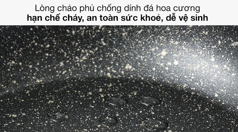 Đường kính chảo 24 cm có thể chiên 3 quả trứng. Bề mặt chảo bằng lớp chống dính đá hoa cương phủ sơn Whitford chịu nhiệt tối đa 315 oC đẹp mắt, bền bỉ, hạn chế cháy dính thực phẩm, dễ dàng vệ sinh sau khi dùng.