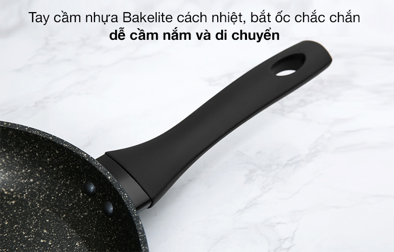 Tay cầm từ nhựa Bakelite cách nhiệt, độ bền cao, bắt ốc vít chắc chắn với thân chảo giúp dễ dàng sử dụng và an toàn với sức khỏe