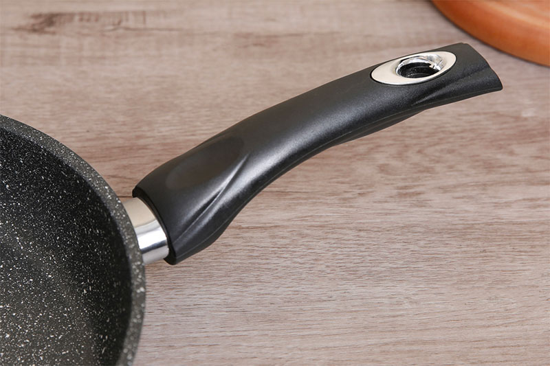 Tay cầm chảo chống dính được lắp chắc chắn vào thân chảo giúp dễ di chuyển, tay còn có móc treo tiện bảo quản
