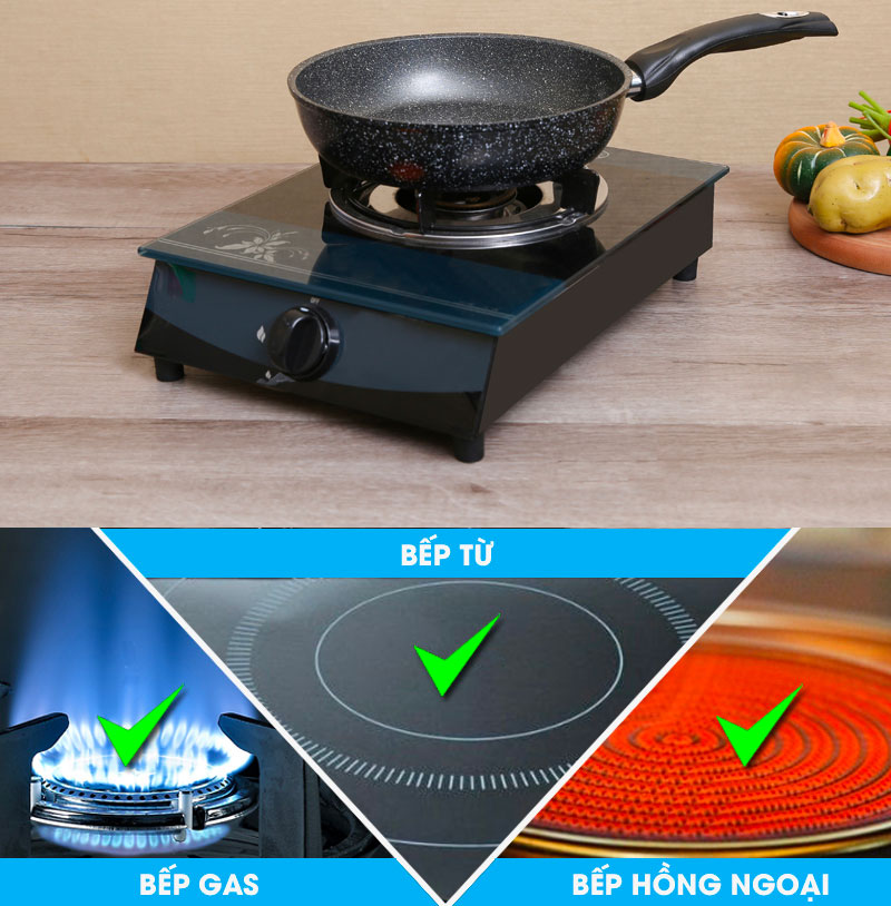 Mẫu chảo DMX này sử dụng tốt trên cả bếp từ, bếp gasbếp hồng ngoại