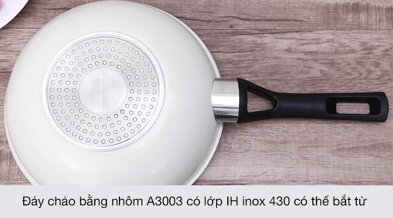 Thành chảo bằng nhôm A3003 nhẹ, khối lượng chỉ 0.64 kg tiện thao tác dễ dàng.