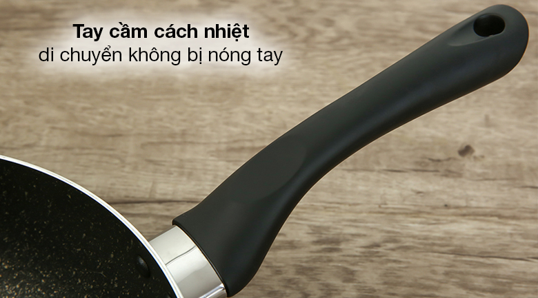 Tay cầm được gắn chắc chắn vào thân chảo, yên tâm khi thao tác. Cuối tay cầm có lỗ treo móc, thuận tiện khi bảo quản.