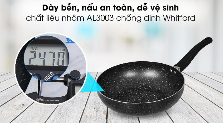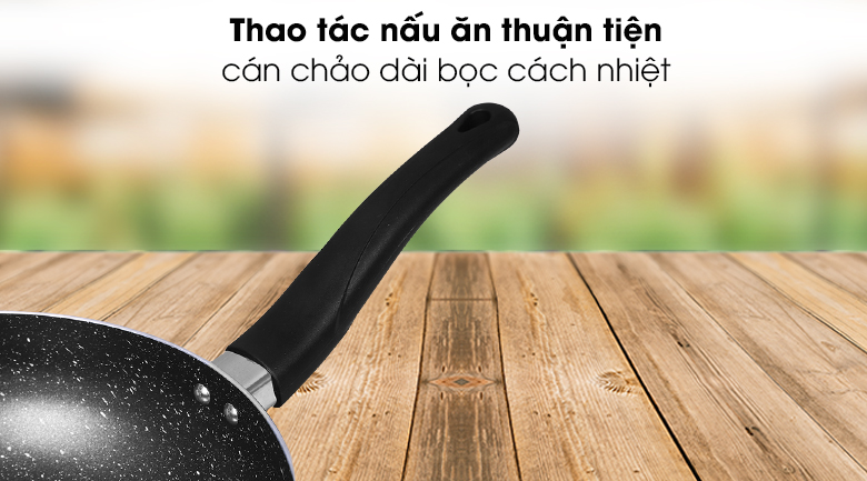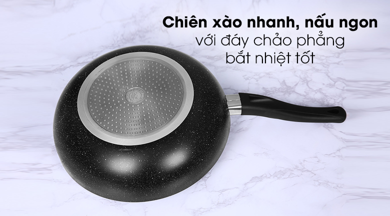 Bề mặt lòng chảo là lớp chống dính vân đá phủ sơn Whitford Xylan chịu mức nhiệt tối đa 380°C bền bỉ, hạn chế cháy dính thực phẩm, đảm bảo an toàn sức khỏe và tiện vệ sinh sau khi dùng.