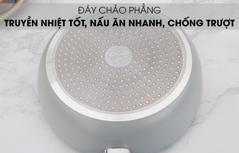 Chảo chống dính Elmich có màu xanh tinh tế, khối lượng chảo nhẹ chỉ 0.5 kg và đường kính 20 cm có thể chiên được cùng lúc 2 cánh gà.