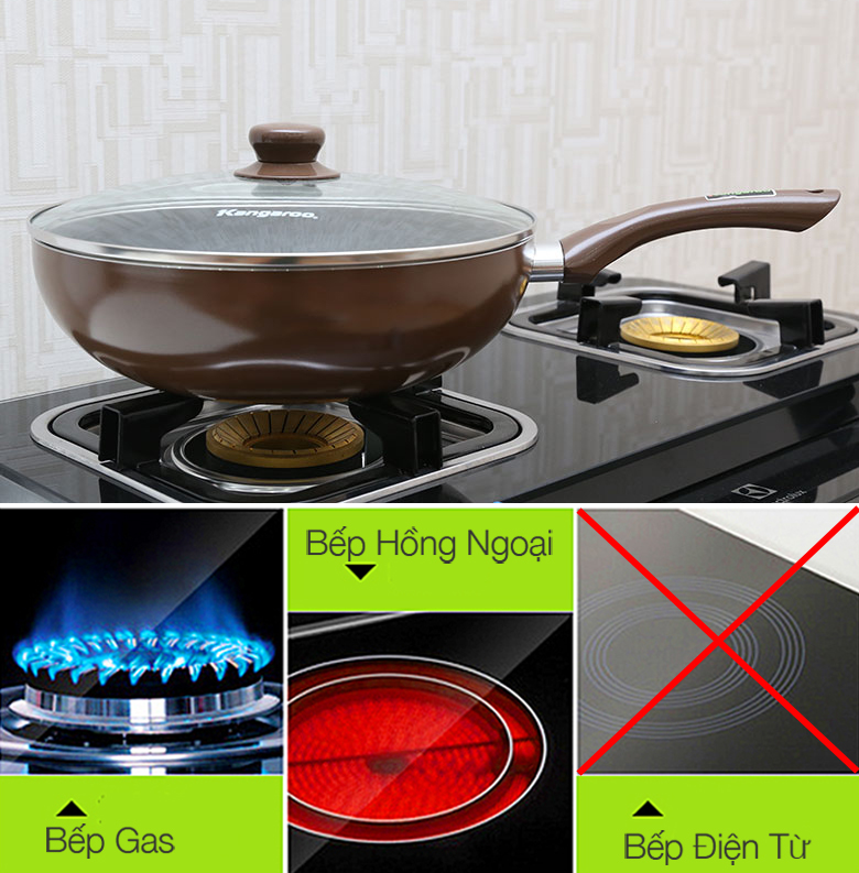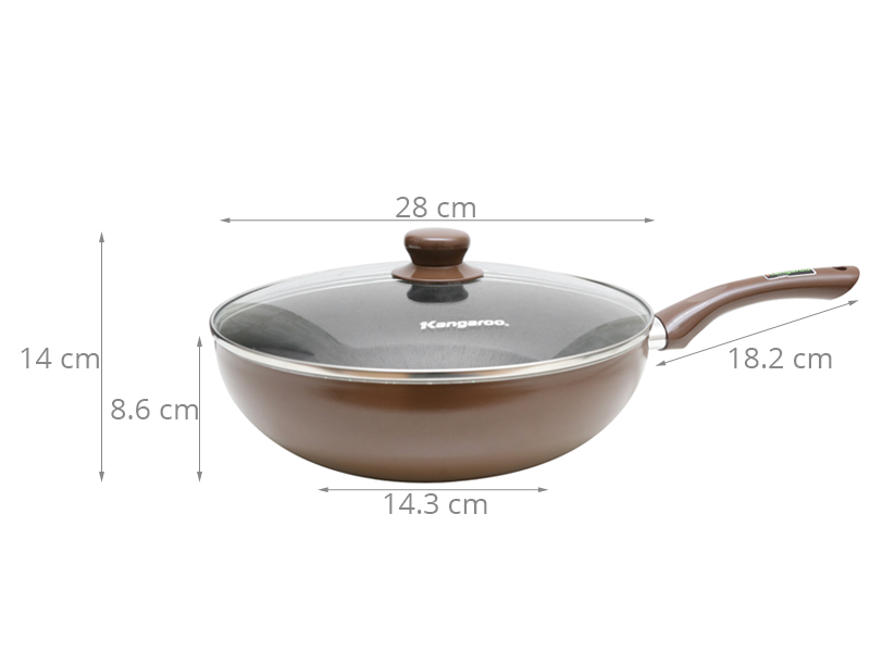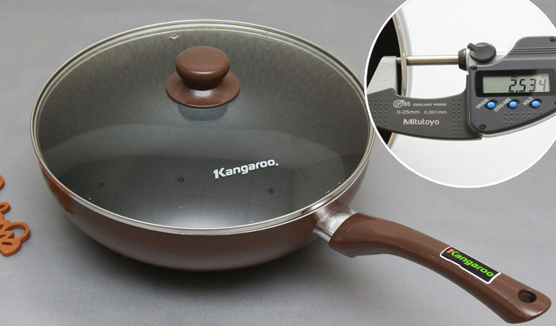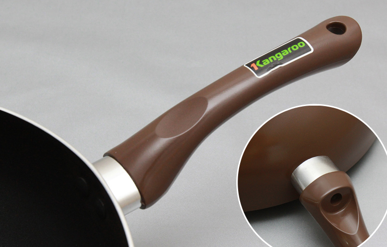 Chảo Kangaroo sản xuất tại Trung Quốc với chất liệu hợp kim nhôm, có độ dày cao, khoảng 2.5 mm giúp giữ nhiệt tốt cho thức ăn.
