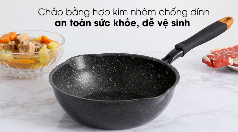 An toàn sức khỏe cho người dùng, chiên, xào ngon, dễ vệ sinh sau khi sử dụng. Chảo có khối lượng 0.67 kg, cầm nắm và di chuyển tiện lợi khi nấu ăn.