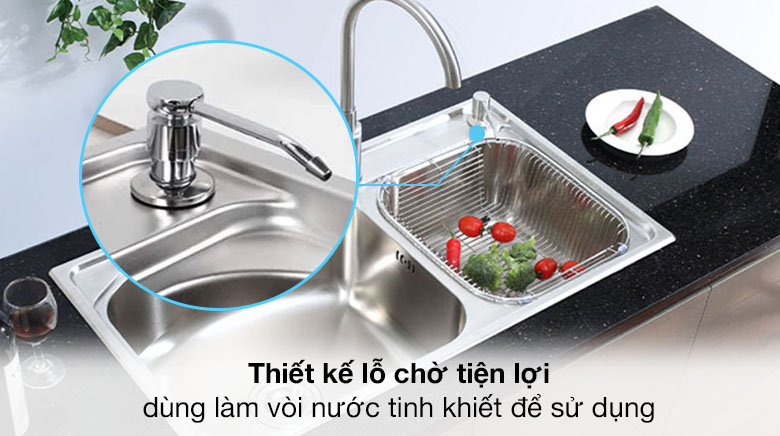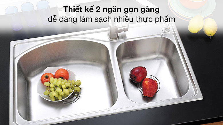 Chậu rửa chén dày 1 mm inox nguyên khối nên cực kỳ cứng chắc, chống móp méo tốt, độ sâu ngăn trái đến 20.5 cm cho thể tích sử dụng lớn, thoải mái, tiện lợi.