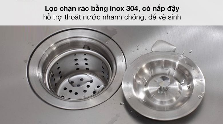 • Lọc chặn rác bằng inox 304 với 2 hộc, giúp thoát nước nhanh chóng.