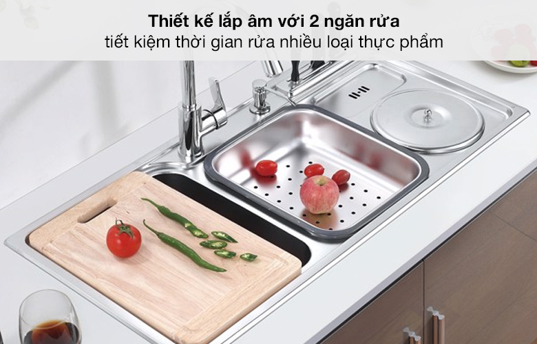 Chậu rửa chén có 2 ngăn rộng rãi tạo sự thoải mái khi sử dụng mà không vướng víu