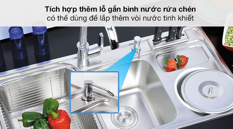Chậu được tích hợp thêm lỗ gắn bình nước rửa chén hoặc có thể dùng để lắp vòi nước tinh khiết
