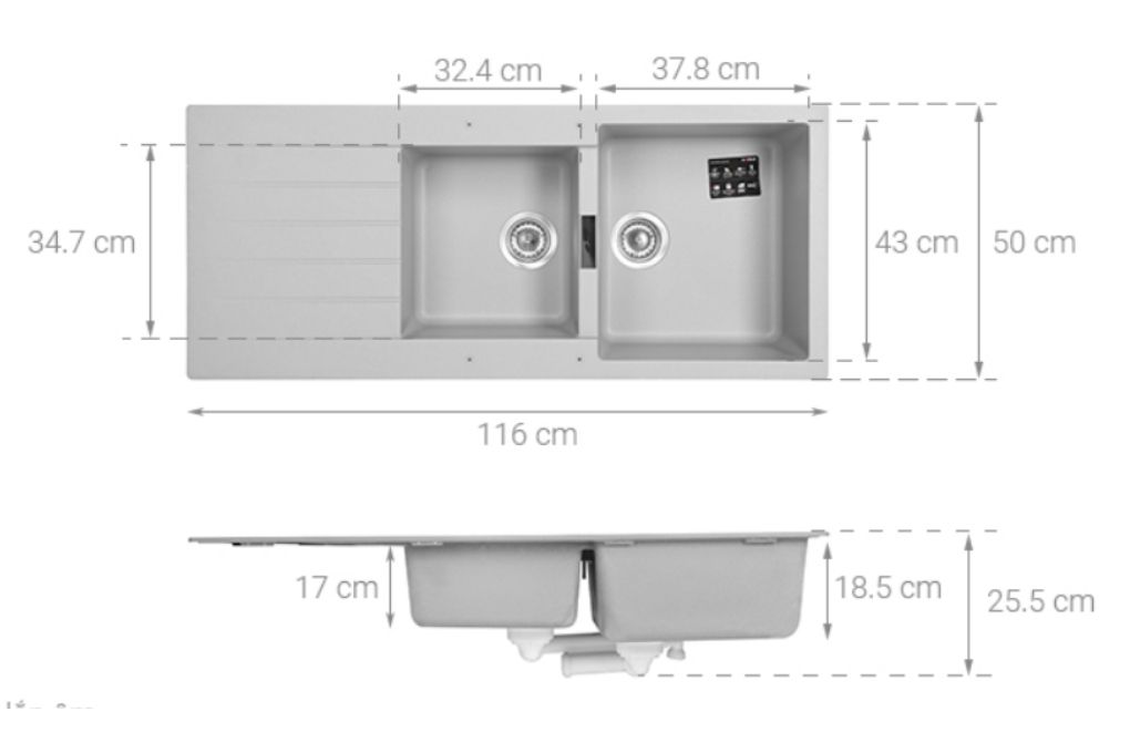 Lắp đặt âm với kích cỡ lỗ đá dài 114.6 cm - rộng 48.6 cm, lắp đặt nổi với kích cỡ lỗ đá dài 114 cm - rộng 48 cm.