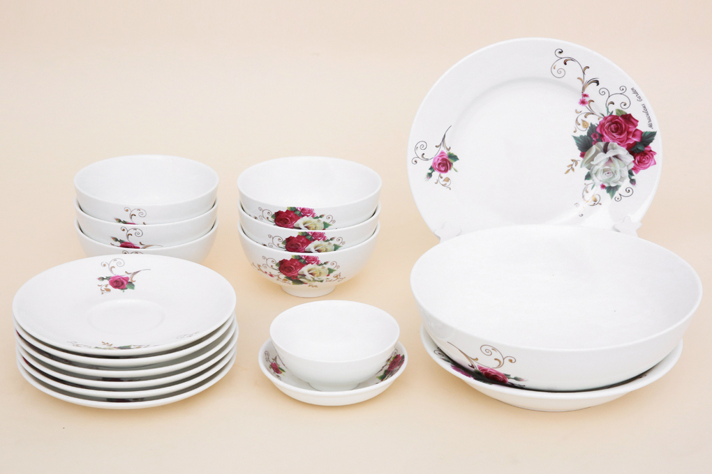 Bộ tô chén dĩa Minh Châu với 6 chén cơm, 8 dĩa lớn/trung/nhỏ, 1 tô canh, 1 dĩa chấm và 1 chén chấm sẽ phù hợp với bàn ăn từ 4 - 6 người