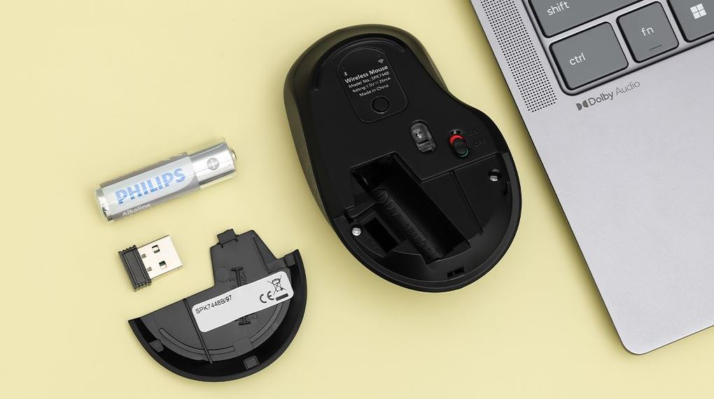 Philips SPK7448 sử dụng một viên pin AA duy nhất, vừa tiện lợi vừa dễ tìm mua. Thiết kế tiết kiệm năng lượng giúp chuột hoạt động trong thời gian dài mà không cần thay pin thường xuyên.