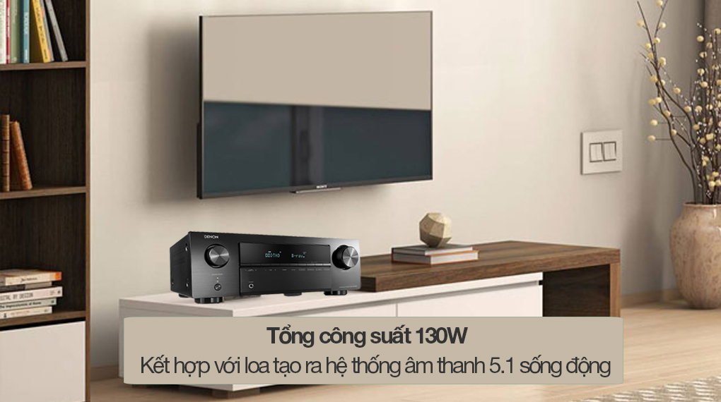 Amply Denon được thiết kế theo hệ thống dàn âm thanh 5.1 với tổng công suất đầu ra ấn tượng đến 130W (70W/ 1 kênh), phù hợp lắp đặt trong diện tích căn phòng từ 10 - 25m2.