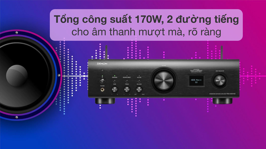 - Amply Denon có tổng công suất 170W (85W/1kênh), 2.0 kênh cho âm thanh phát ra to rõ, chuẩn xác đến người nghe.