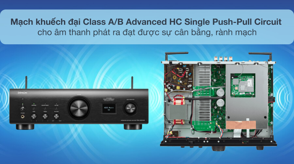 - Mạch khuếch đại Class A/B Advanced HC Single Push-Pull Circuit: cho âm thanh phát ra đạt được sự cân bằng, tinh tế đến từng chi tiết. Khả năng chịu được cường độ lớn trong mạch Single Push-Pull giúp amply có thể vận hành lâu với mức âm lượng lớn trong thời gian dài với các loa có trở kháng thấp mà không hề bị méo tiếng.