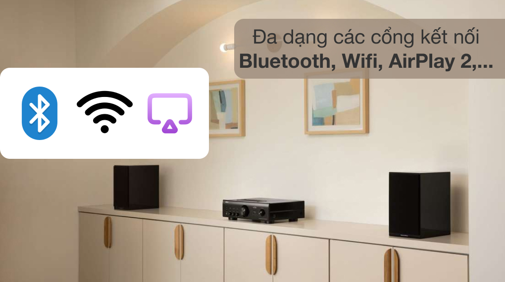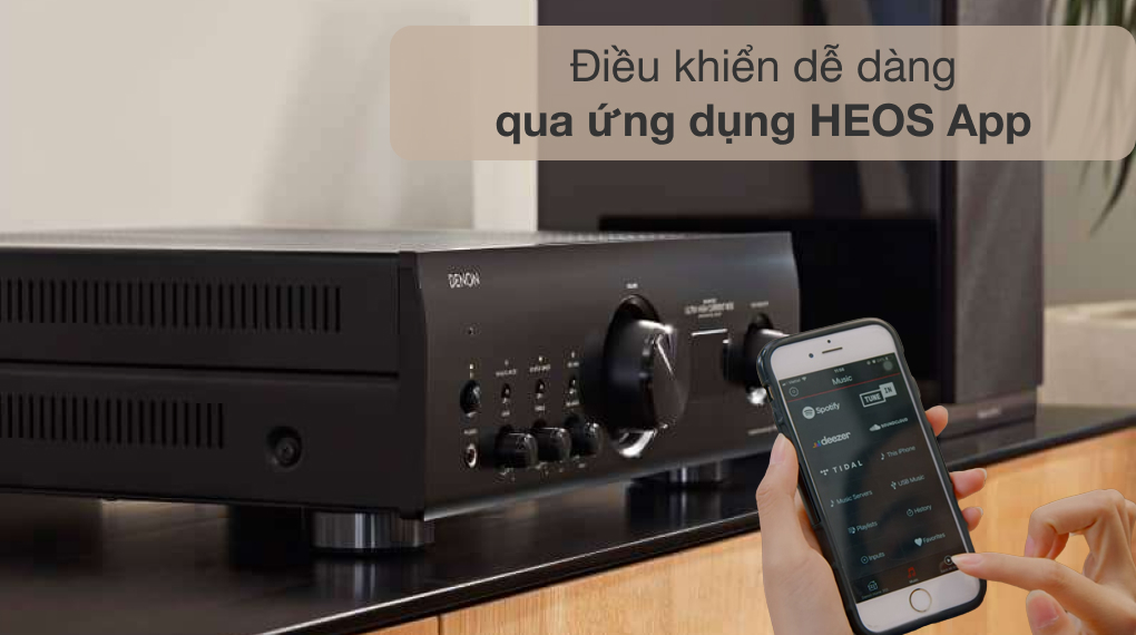 - Ngoài ra bạn có thể nghe nhạc từ amply thông qua AirPlay 2 và Wifi nhờ vào ứng dụng HEOS.